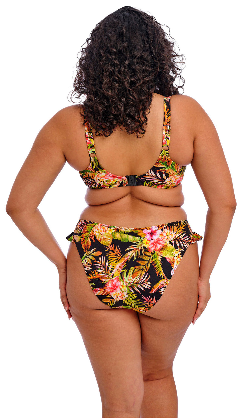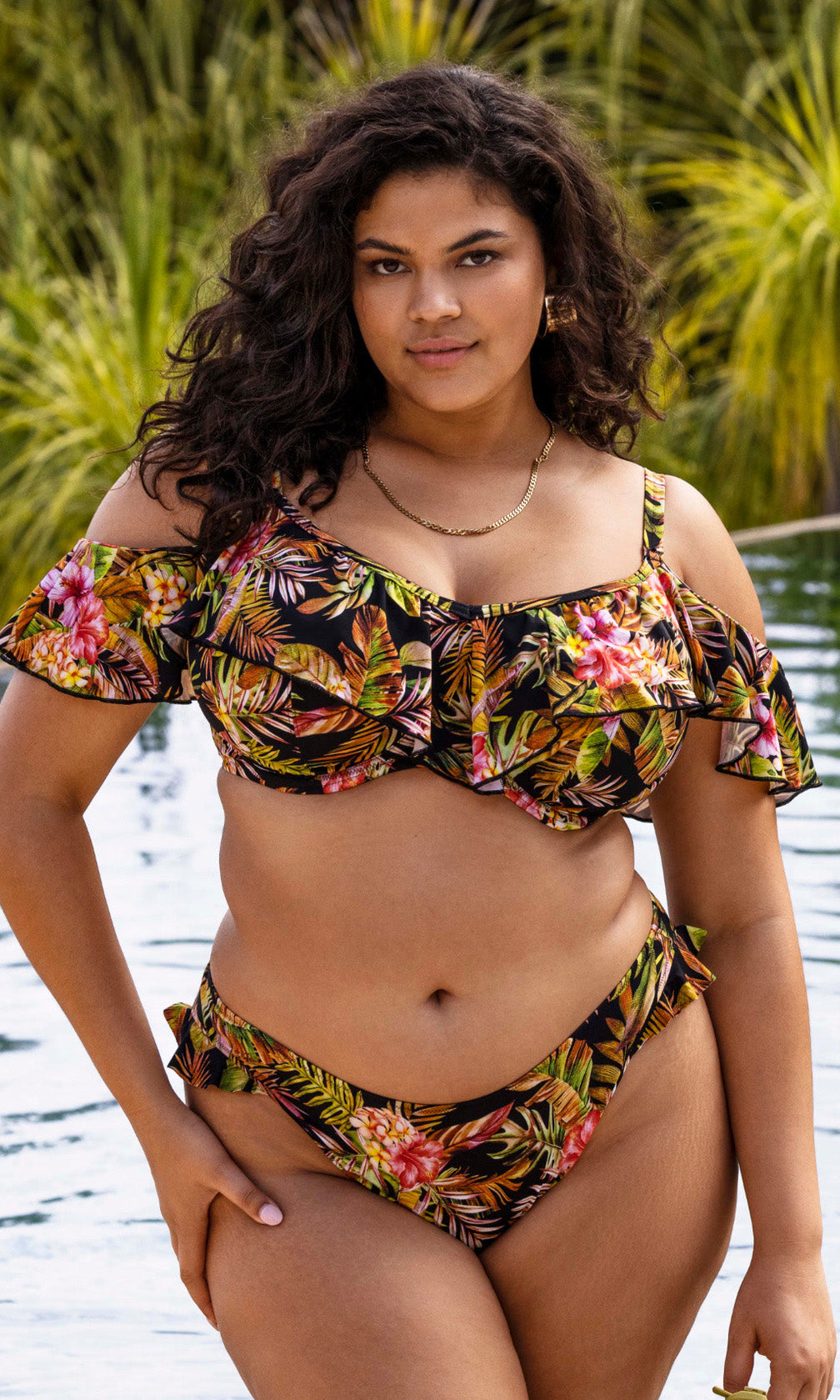 Radiate confidence all summer long with all-new Tiger Valley. Leafy greens are met with a pop of hibiscus pink, all washed in slightly sepia tones, across an easy to wear Black base. Crafted to combine superb fit with striking design, we’re obsessed with the flirty frill styling on the UW Bikini Top that can be worn on or off the shoulders.