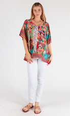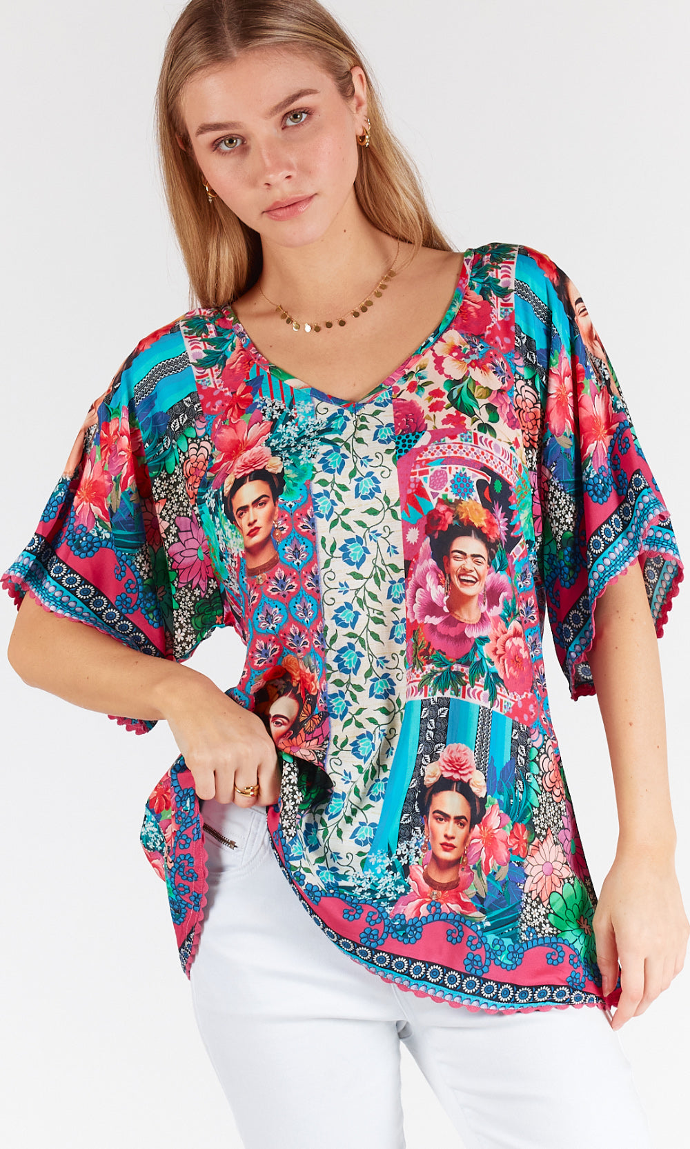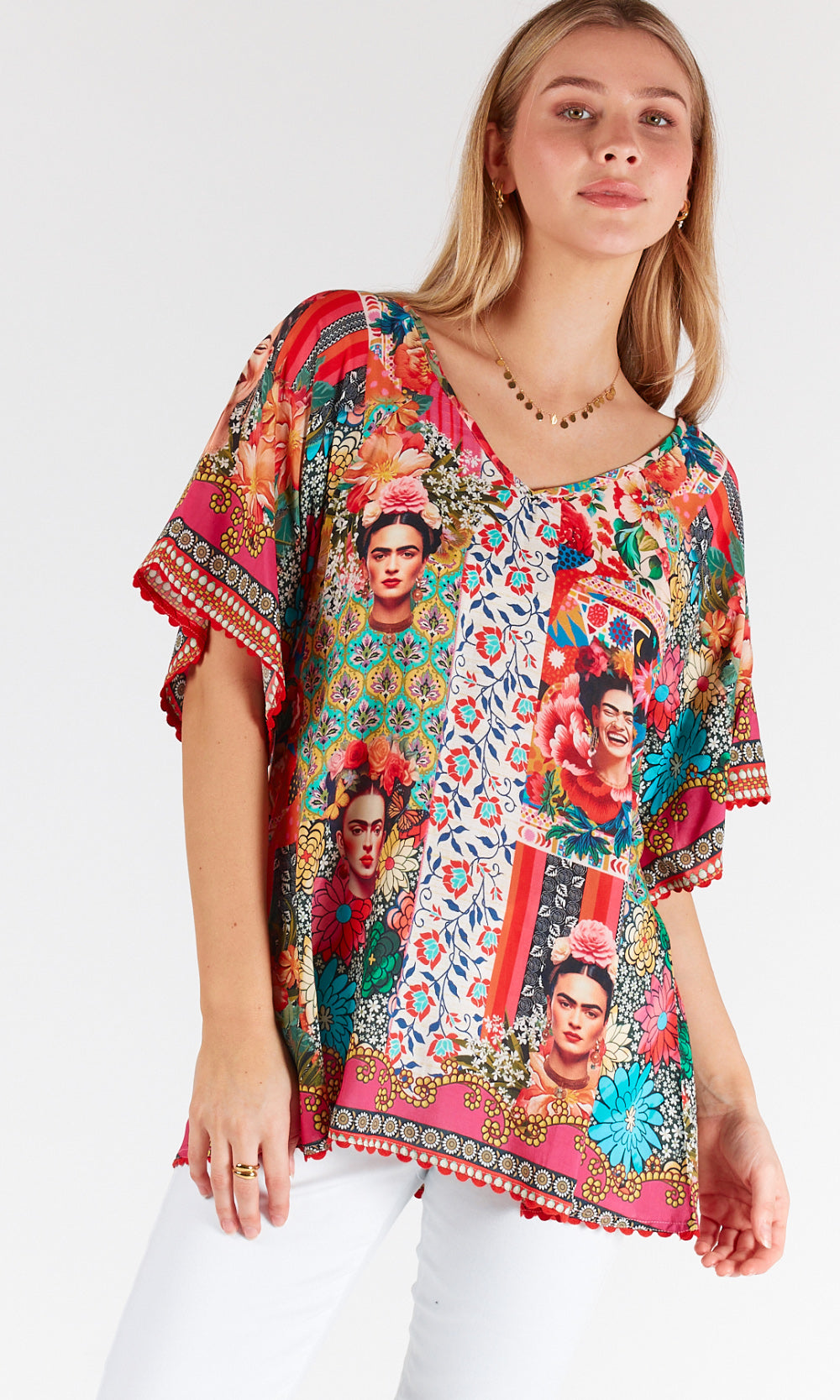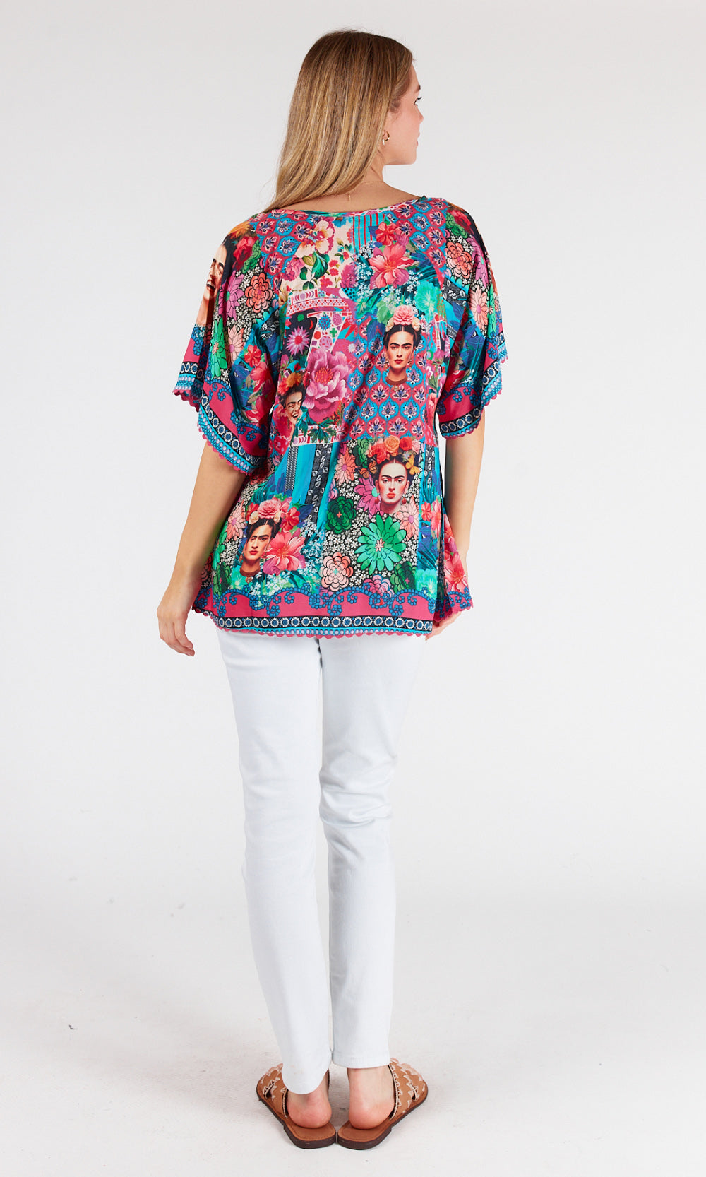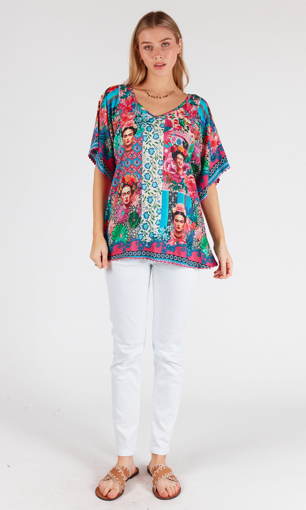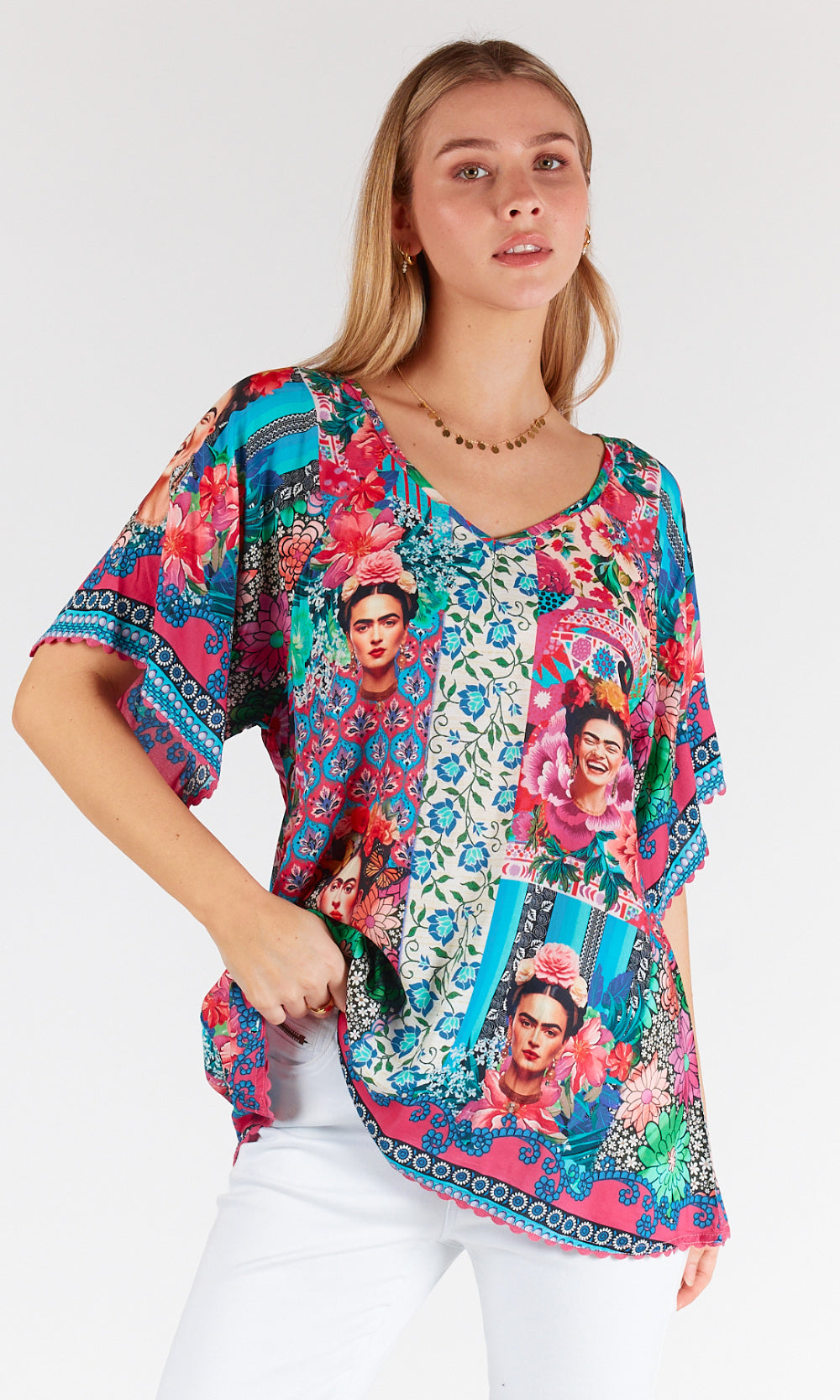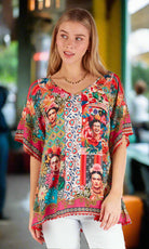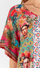 Embrace the vibrant energy of Frida Kahlo, featuring a stunning print inspired by the renowned artist, this top exudes Mexican colours and vibrancy.